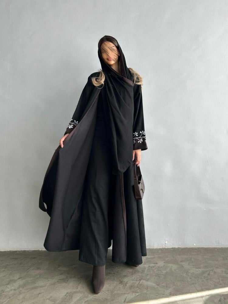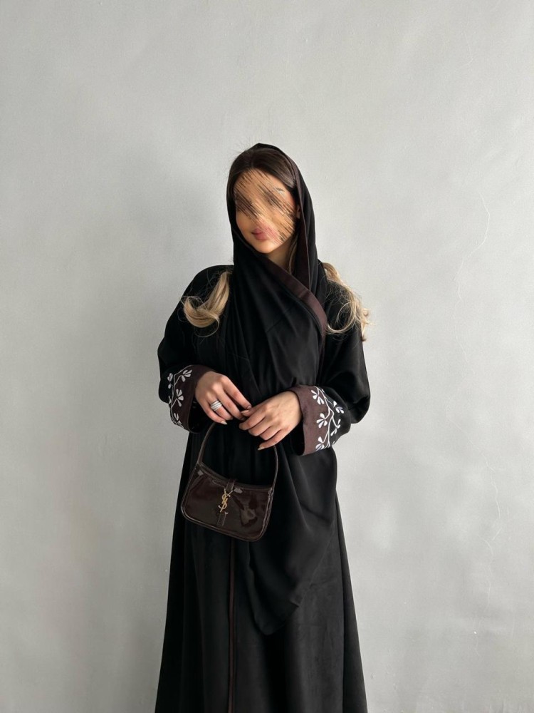 - ولأن تميز العباية يكمن في تفاصيلها فتحصلين على قطعة مطعمة بالجوخ البني الناعم على الأطراف والأكمام مع تطريز ناعم باللون الأبيض لتنعمي بقطعة راقية تبرز أنوثتك وتجعل إطلالتك خاطفة بكل سهولة.