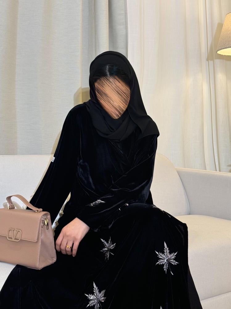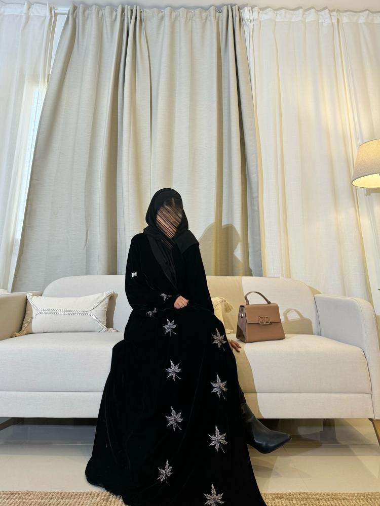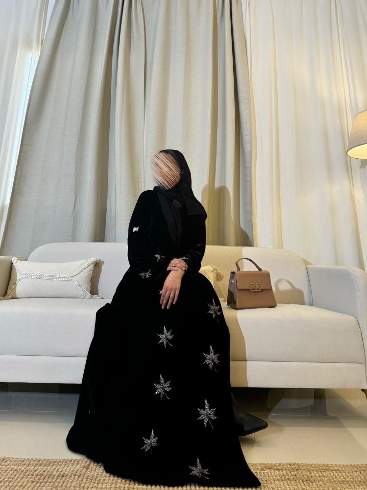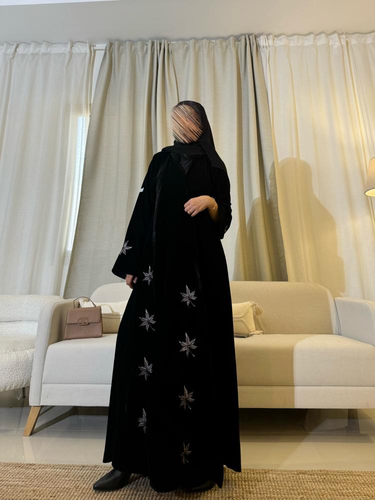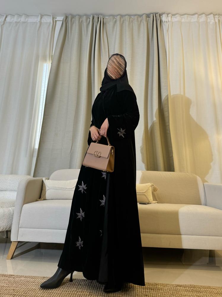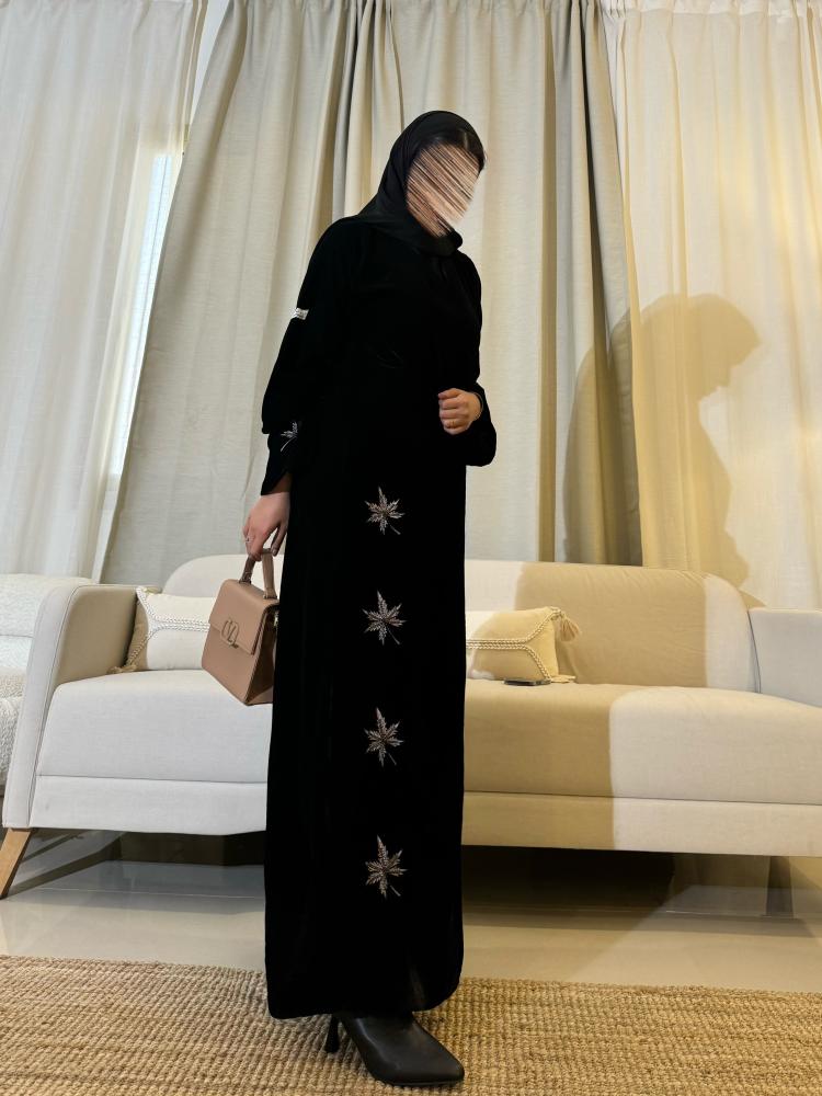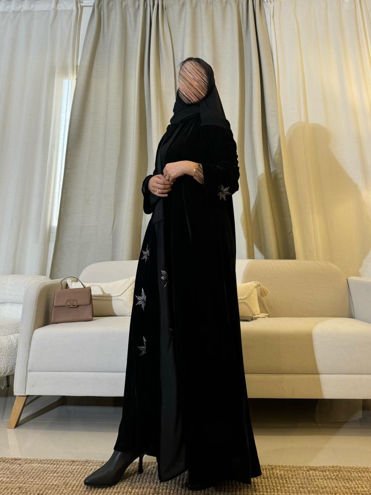 -التدخيلة على العباية مخمل مع تطريز وترتر، على الأكمام ومن الأمام من نص العباية.