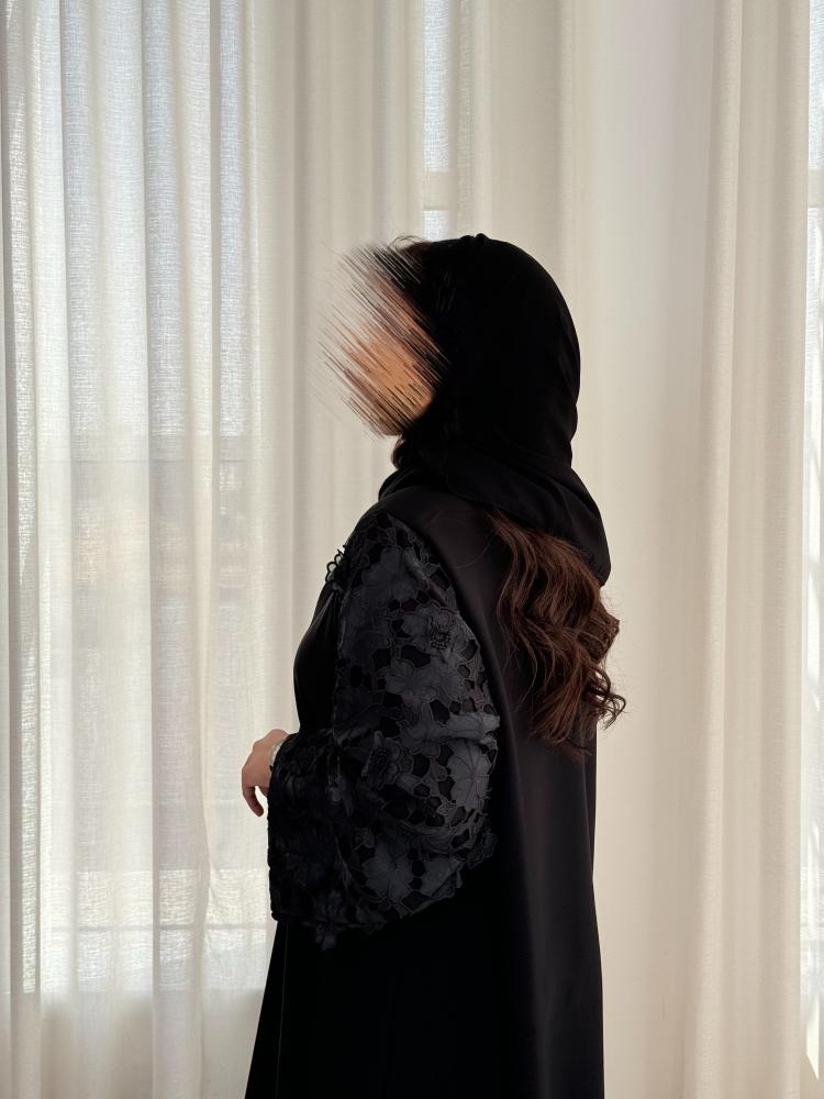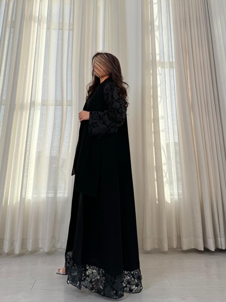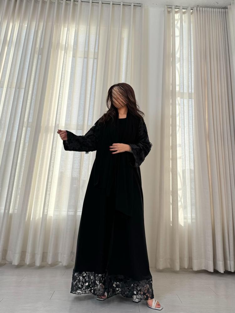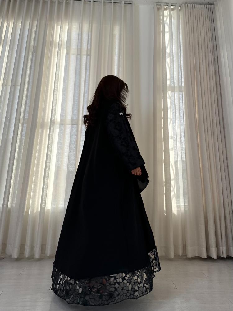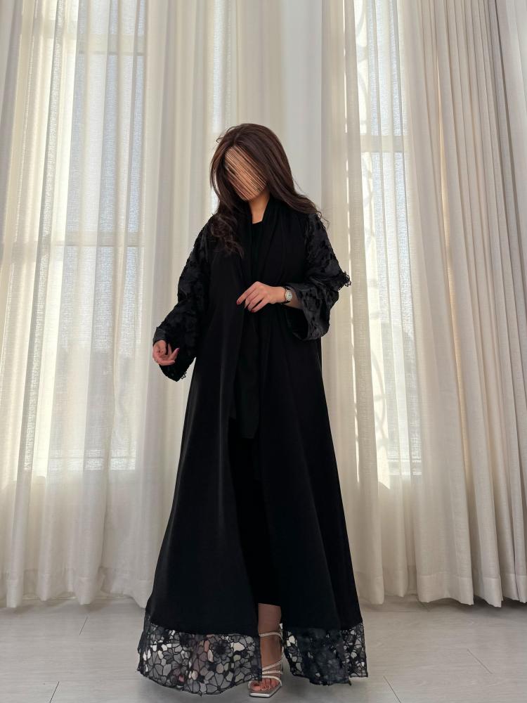 -قماش دانتيل على الأكمام كاملة، وفي الأمام أسفل العباية.